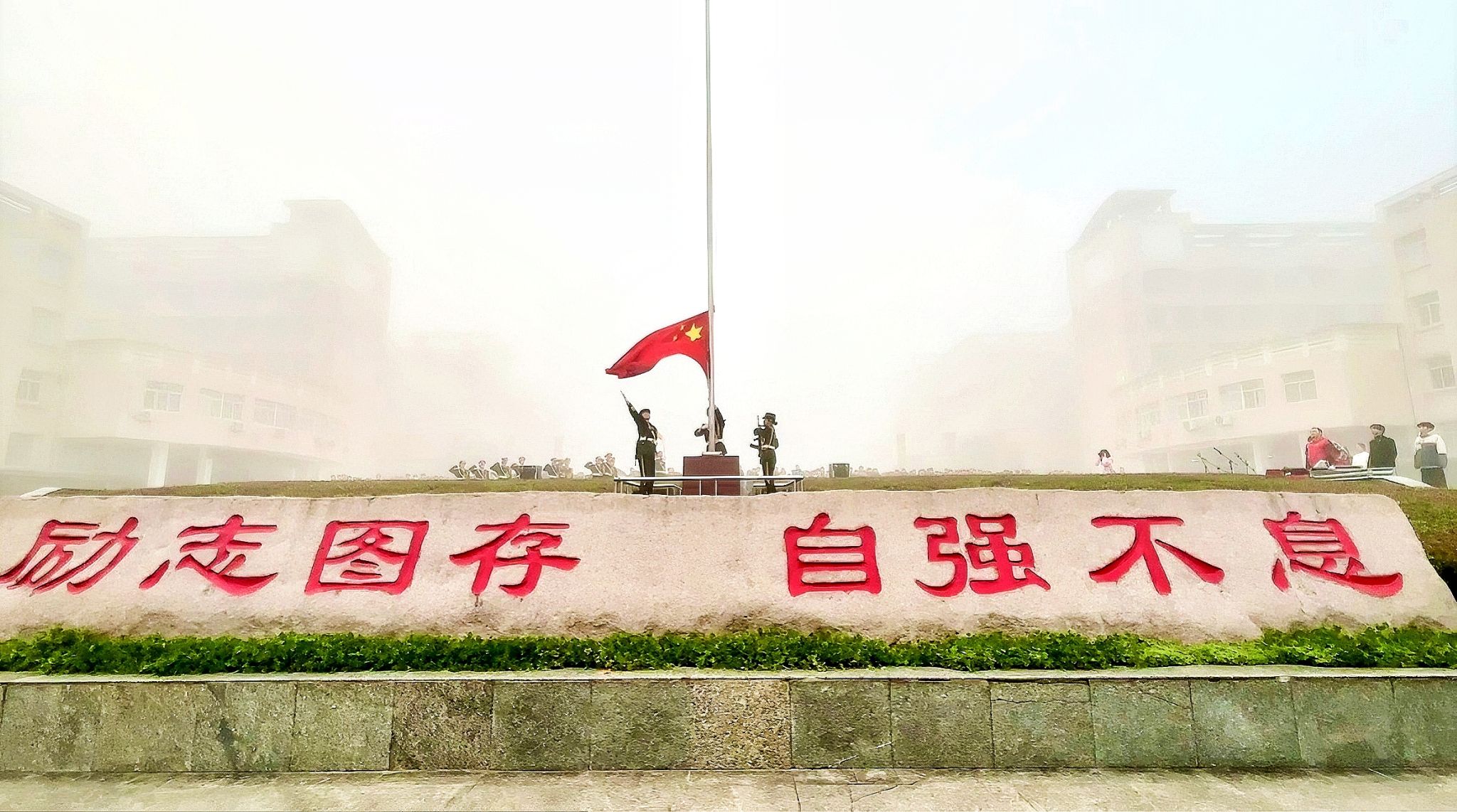 晨雾轻笼天地,五星红旗伴着国歌缓缓上升,红绸与雾中晨光温柔交织,猎猎声里既有岁月的厚重,更藏着冲破迷雾的坚定。全体师生昂首肃立,目光穿透薄雾随国旗攀升,仿佛与历史长河中那些坚守信仰、冲破迷雾的身影隔空相望。升旗仪式落幕后,张丹丹讲师以“光影”为引串联起跨越时空的精神对话。